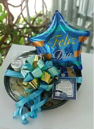 Bandeja decorada con lazo y globo metalizado, Porción de frutas picadas, Porción de bollo o yuca cocida, Porción de chicharrón o huevos revueltos con salchicha ranchera , Porción de queso, suero , Porción de dulces variados, 1 jugo y Tarjeta