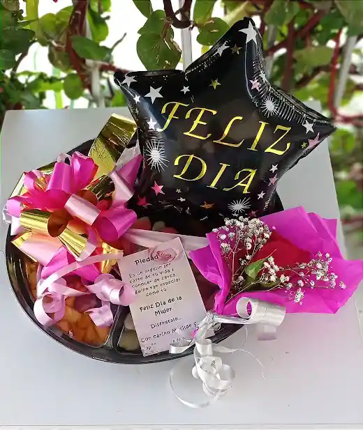 Bandeja decorada con lazo y globo metalizado, Porción de frutas picadas, Porción de bollo o yuca cocida, Porción de chicharrón o huevos revueltos con salcicha ranchera, Porción de queso, suero Porción de dulces variados, 1 jugo Y Tarjeta.