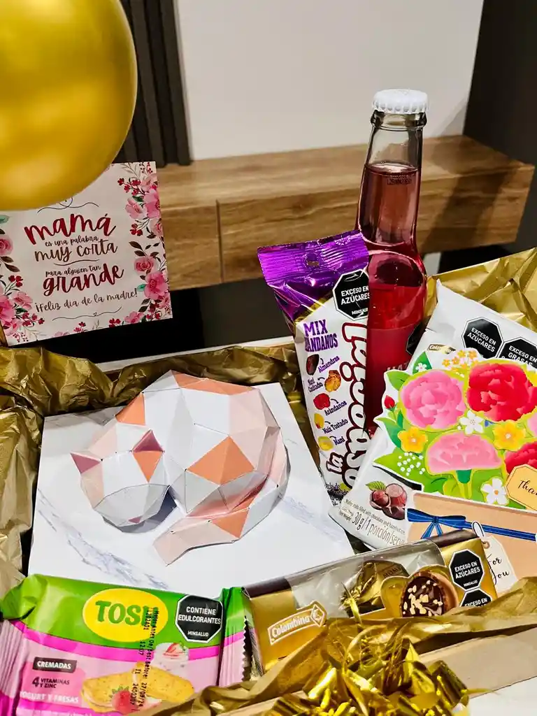 CONTIENE: 1 soda Hatsu 1 Galletas Tosh fresa 1 Mani la especial 1 barquillos piazza deleite 1 Chocholates moment x 3 und 1 mensaje Feliz día mama 1 tarjeta de flores 1 gato en arte de papel (tamaño con base de 16x16 cm)