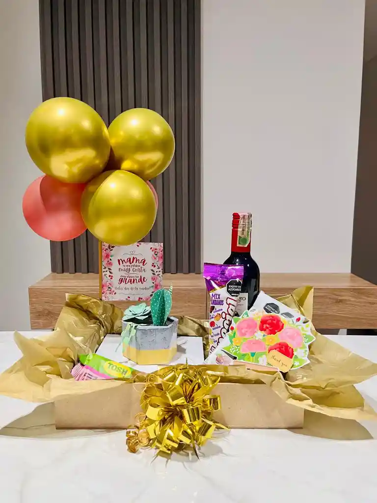 CONTIENE: 1 Vino Gato negro x 375ml 1 Galletas Tosh fresa 1 Mani la especial 1 barquillos piazza deleite 1 Chocholates moment x 3 und 1 mensaje Feliz día mama 1 tarjeta de flores 1 matera arte de papel (tamaño con base de 16x16 cm)