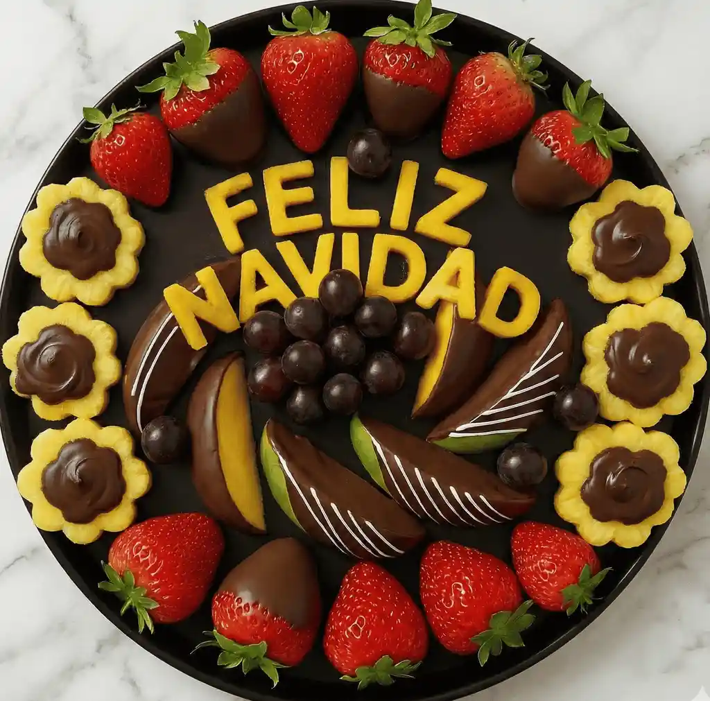 Bandeja Feliz Navidad – Un detalle dulce, fresco y lleno de magia navideña. Celebra esta Navidad con una bandeja llena de color, sabor y mucha alegría. Nuestra Bandeja Feliz Navidad combina frutas frescas y decoraciones artesanales para sorprender a quien más quieres. ✨Incluye: 🍍 Flores de piña bañadas con un toque de chocolate. 🍇 Uvas rojas frescas y jugosas. 🍓 Fresas cubiertas de chocolate. 🍏 Trozos de manzana recubiertos con chocolate. 🥭 Letras de mango natural que forman la frase “Feliz Navidad”. 💌Tarjeta dedicatoria incluida. 🎀 Envoltura en papel celofán con lazo de color. 📏Tamaños y precios: 🔸 30cm de diámetro – 45 porciones aprox. Un regalo perfecto para compartir en familia, agradecer a tus clientes o acompañar cualquier celebración navideña con un detalle saludable, elegante y diferente.