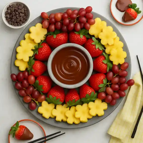Para que los invitados se sumerjan en una dulce experiencia. ✨ Incluye: Fresas frescas, uvas y pequeñas margaritas de piña, fondue de chocolate de leche semidulce en un recipiente de 8oz. 💌 Tarjeta dedicatoria incluida. 🎀 Envoltura en papel celofán con lazo de color. 🍽 Bandeja blanca desechable. 📦 Frutas sujetas a disponibilidad. 📏Tamaños y precios: 🔸 30 cm de diametro.