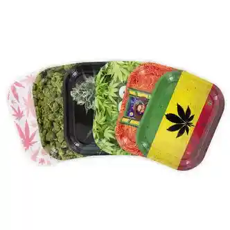 Bandeja metálica para liar y organizar productos cannábicos.