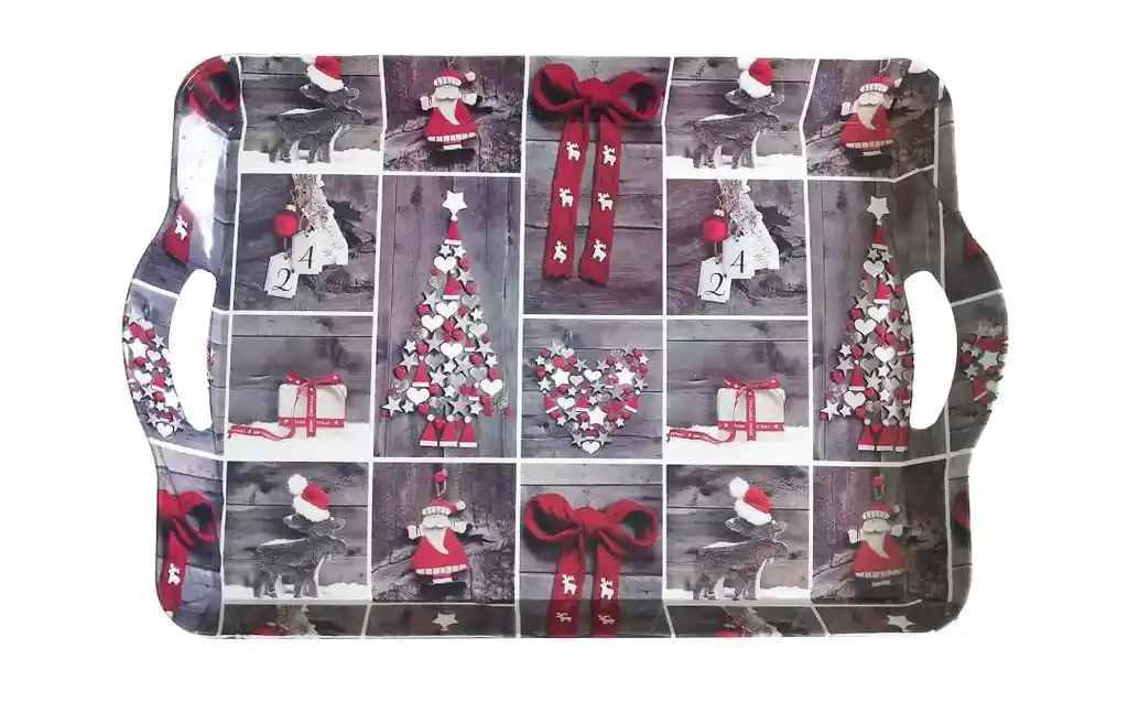 Decora tus celebraciones con encanto y calidez con nuestra Bandeja Navideña Rústica “Corazones y Estrellas”. Su diseño combina motivos navideños como árboles, lazos, renos y corazones en tonos rojo, blanco y gris sobre un fondo de madera envejecida, creando una estética acogedora y elegante. Ideal para servir bebidas, postres o desayunos navideños, o como elemento decorativo para tu mesa o cocina. Fabricada en material resistente, con asas laterales para un fácil agarre y un acabado brillante que resalta cada detalle festivo.