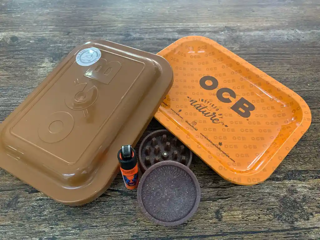 Bandeja con tapa portatil de marca OCB y facil de llevar + grinder fabricado en cañamo prensado de la marca OCB + una candela tipo clipper