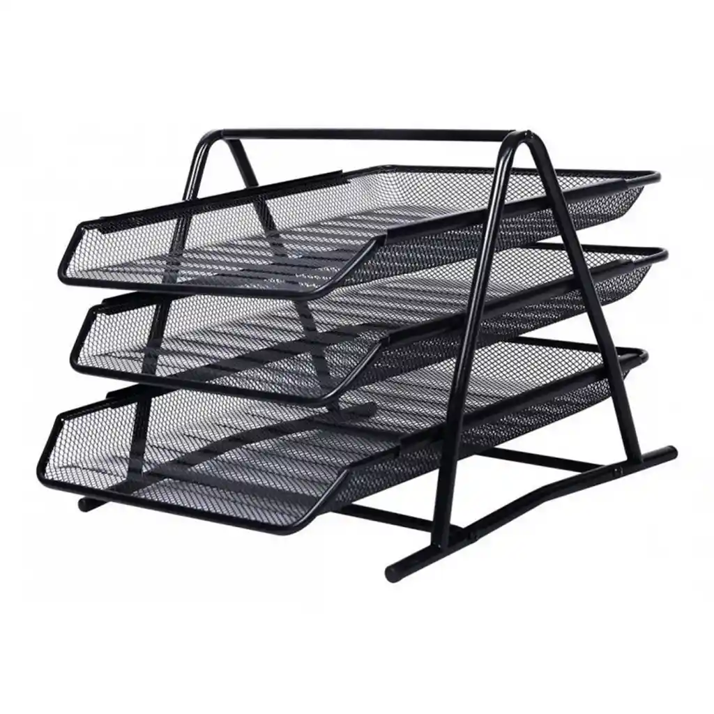 Maximiza la productividad y mantén tus documentos importantes al alcance de la mano con nuestro Organizador de Documentos de 3 Niveles. Ideal para oficina y hogar, este accesorio de diseño moderno y compacto se adapta perfectamente a cualquier escritorio, proporcionando una solución de almacenamiento que ahorra espacio y reduce el desorden.Este organizador no es simplemente un accesorio, es una inversión en tu eficiencia laboral y bienestar al reducir el desorden visual y facilitar la organización. ¡Optimiza tu espacio de trabajo con nuestro Organizador de Documentos de 3 Niveles y haz que cada minuto en tu escritorio cuente! DETALLES Diseño Versátil: Tres bandejas espaciosas para clasificar documentos, cartas y carpetas. Estilo Moderno: Acabado en color negro elegante que complementa cualquier decoración de oficina o estudio. Organización Eficaz: Ayuda a priorizar papeles importantes y a mantener un área de trabajo ordenada. Fácil Acceso: Su diseño abierto permite un fácil acceso a los documentos desde cualquier nivel. Estabilidad Asegurada: Patas antideslizantes que garantizan una base firme sin rayar la superficie de tu escritorio. Instalación Sencilla: No requiere herramientas para su montaje, fácil de ensamblar y desmontar. **INFORMACION IMPORTANTE **El color de la foto es referencial para que puedas ver los atributos del producto y al mismo tiempo es la opción 1 nuestra de despacho. Pero dejamos la aclaración para que lo tengas presente por si te llegara en otro color.** NOTA: La foto de este producto ha sido ambientada, por lo cual no incluye ningún adorno, ni accesorios, ni piezas adicionales ni ningún otro elemento que lo acompañan.