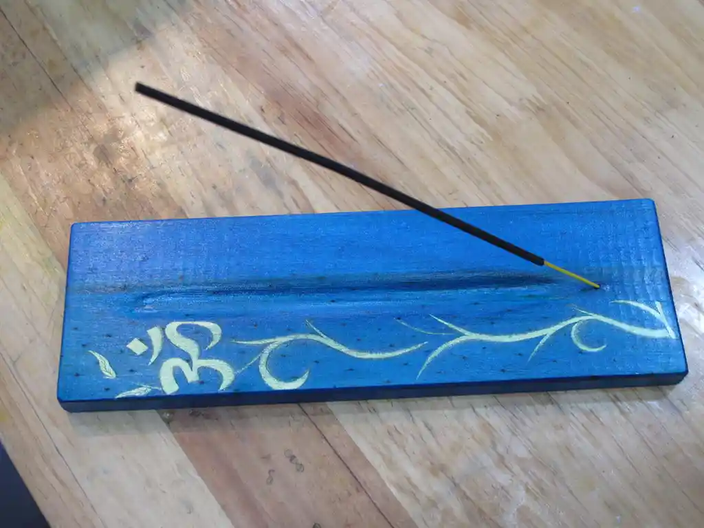 Bandeja Porta Incienso En Madera Color Azul Y Simbolo Om