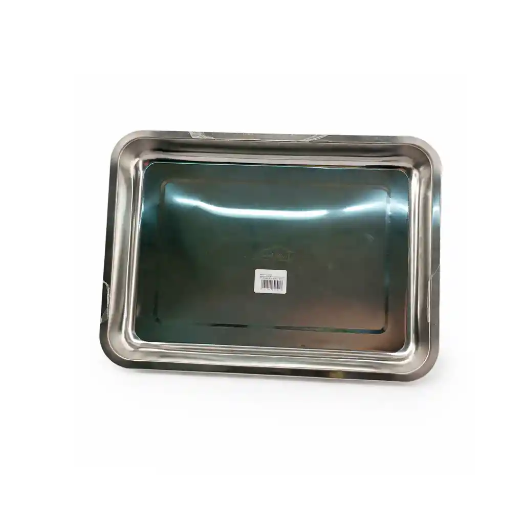 Bandeja rectangular de 40 x 30 cm. Fabricada en acero resistente. Acabado plateado elegante. Ideal para servir alimentos y bebidas. Diseño amplio y funcional. Bordes elevados para mayor seguridad. Superficie lisa y duradera. Apta para hogar y negocios. Perfecta para cocina o eventos. Material firme y de calidad. Diseño práctico y versátil. Apto para contacto con alimentos y bebidas . Fácil limpieza y mantenimiento. La imagen ha sido ambientada; no incluye accesorios adicionales y el color puede variar según la iluminación.