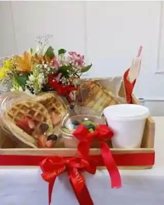 Hermoso desayuno sorpresa premium ideal para sorprender en cumpleaños, aniversarios o fechas especiales. Incluye waffles, sanduche de pechuga de pollo, fruta, postre, bebida caliente(cafe con leche o chocolate), flores y presentación en bandeja con moño decorativo y tarjeta personalizada Elaborado con amor por Los Regalos de Juanita