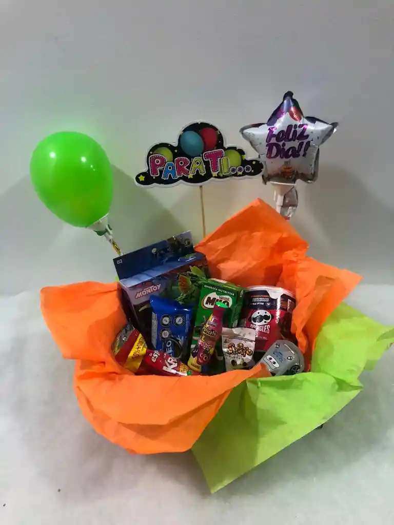 Contiene: 1 Dinosaurio armable 1 Milo 1 chocolate carro 1 pringles x 40 gr 1 Galleta oreo 1 Sapito 1 Mani kraks 1 Potecito polvo acido 1 Oka loka 1 Jelly beans 1 cherry sour 1 Bomba metalizada 1 Letrero feliz día 1 Bomba Papel seda Caja de 27x18,5 x 8 cm