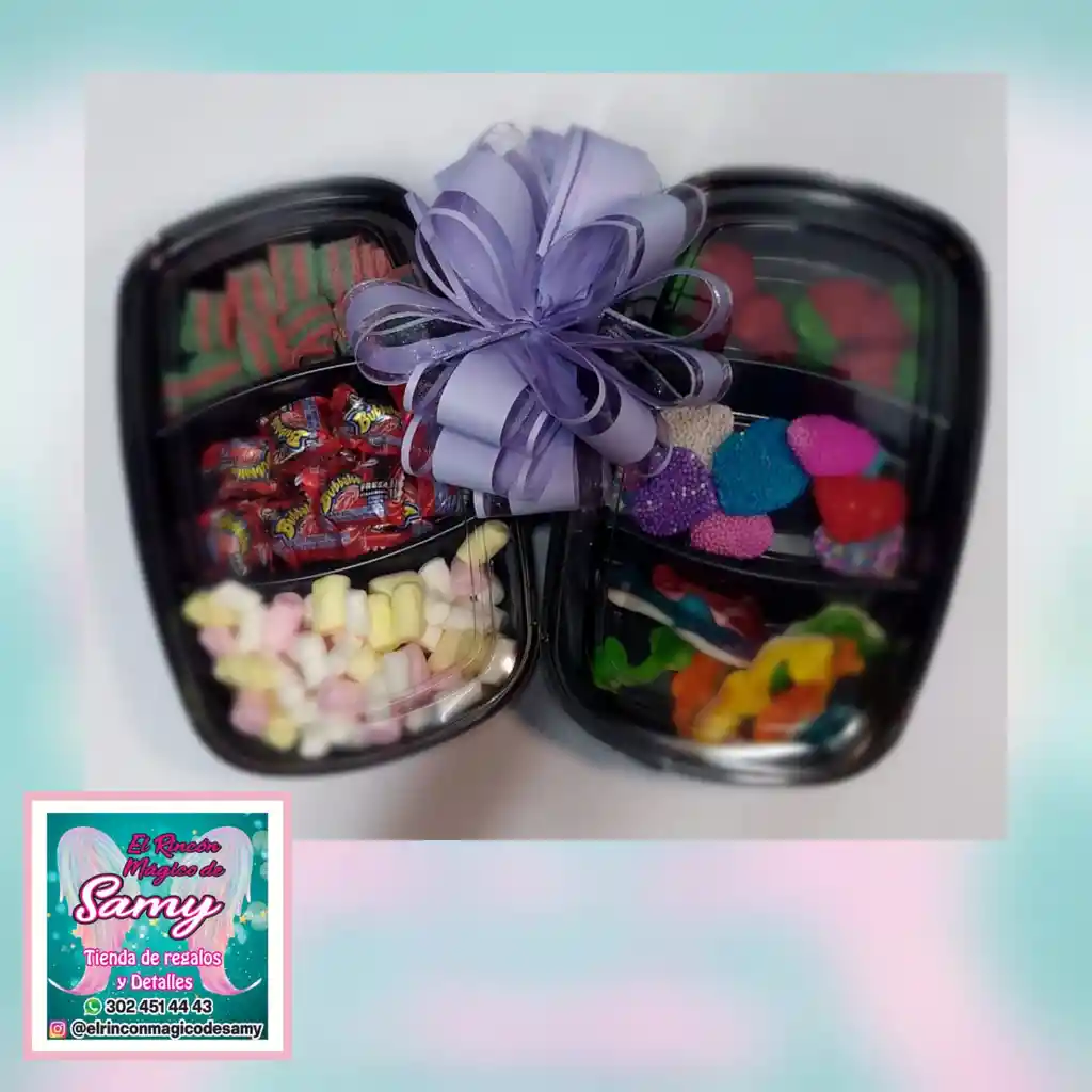 ricas bandejas de dulces con gomitas y chocolates a tu gusto con un moño y tarjeta marcada