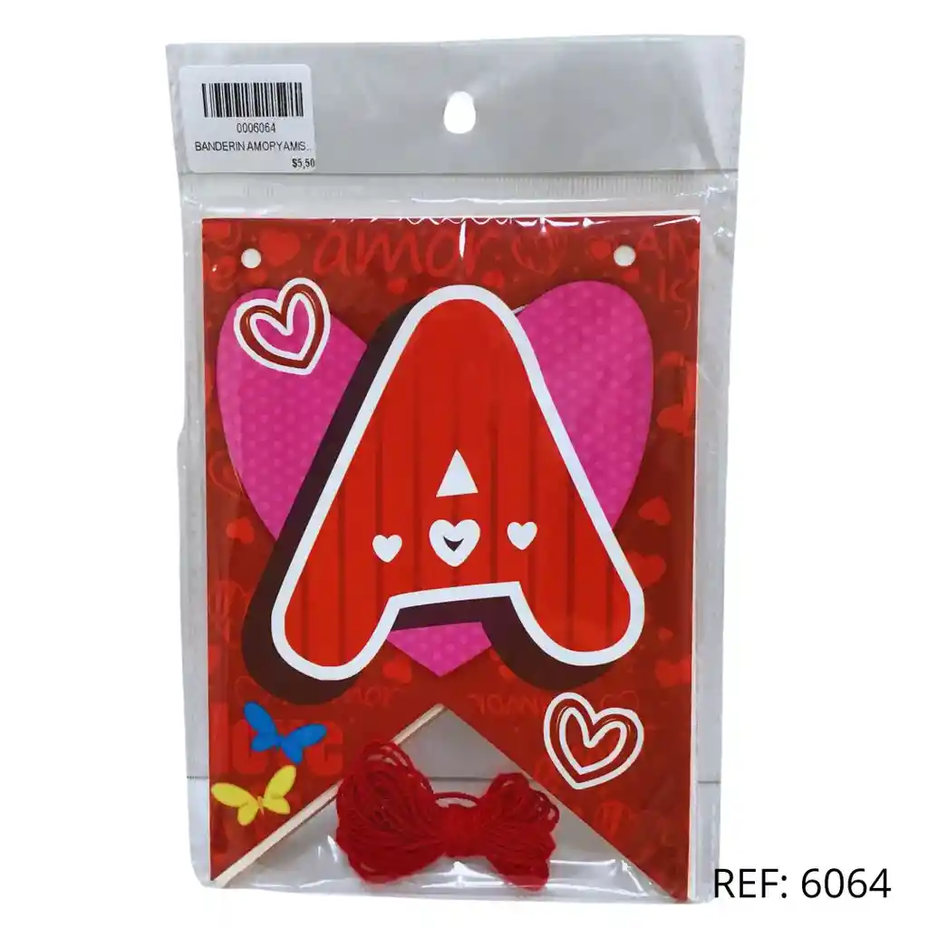 Banderín decorativo Amor y Amistad en tonos rojos con corazones y mariposas. Incluye cinta para colgar fácilmente.