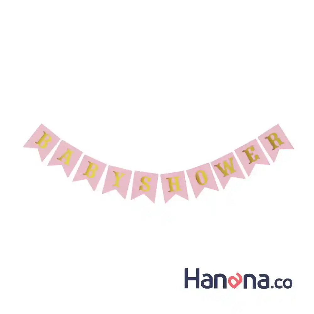 Banderin o letrero de baby shower en Rosado con letras doradas en carton delgado. todo sujeto en cinta de tela rosa pastel. En total tiene un largo de 3 metros y cada pieza tiene una dimención de 20x16 cm.