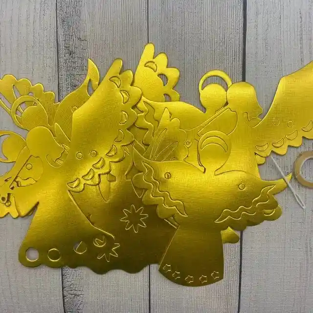 ¡Decoracion Celestial Para Tus Fiestas! Crea un ambiente mágico y festivo con este hermoso banderín troquelado que presenta únicamente figuras de ángeles. Perfecto Para: Fiestas navideñas bautizos primeras comuniones baby showers o cualquier evento religioso o temático que requiera un toque de elegancia dorada. Diseño Y Material: Figuras detalladas de ángeles (con arpas) fabricado en cartulina metálica de alta calidad con acabado brillante Dorado. Fácil De Colocar: Incluye la cuerda o cinta necesaria para armar y colgar el banderín rápidamente en cualquier pared o espacio. Largo Aproximado: (Añade aquí el largo en metros o pies si lo tienes).
