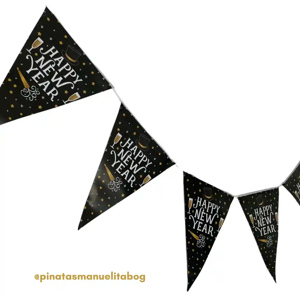 Banderín en cartón en color negro con estampado en color blanco y dorado en Happy New Year, tiene un tamaño de 2.40 de largo totalmente extendido. Feliz año, año nuevo, decoración feliz año, decoración año nuevo, 31 de diciembre, 1 de enero, fin de año, feliz 2026.