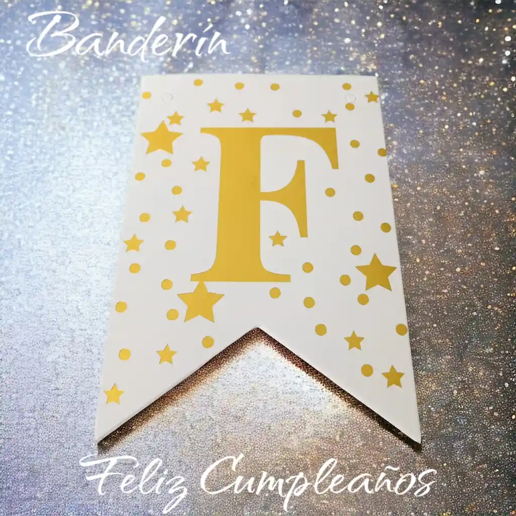 Banderín Feliz Cumpleaños Color: Blanco con estrellas y puntos Dorados Medidas: Alto:16.5 cm Ancho:11.5 cm