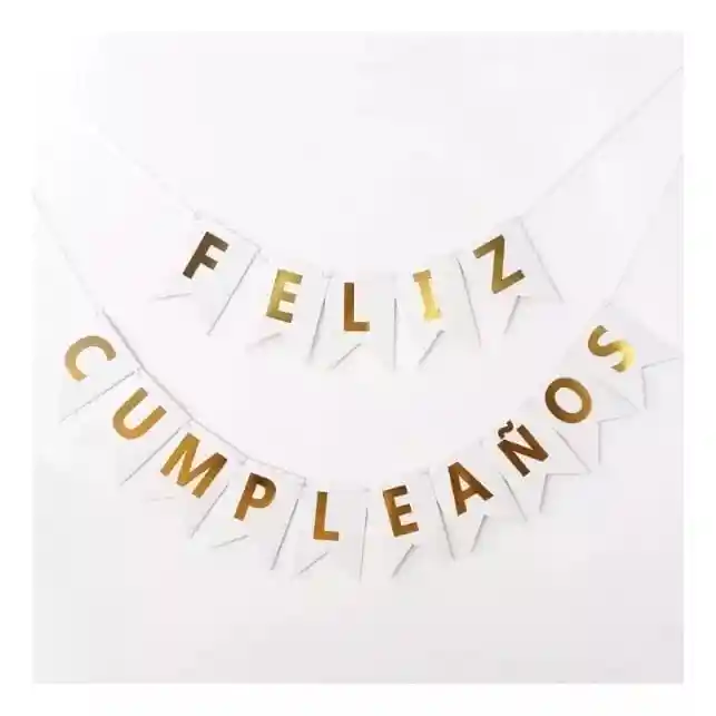 Cartel Feliz Cumpleaños tipo Guirnalda •Color: Blanco letras Doradas •Total de letras: 15 •Cada Banderín mide: 16.5cm x 12 cm •Se extiende aproximadamente hasta: 1,8 mts. •Incluye Cinta Para Colocar las Letras