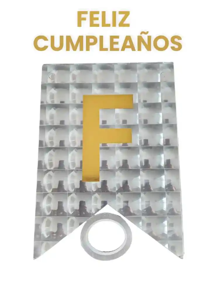 BANDERIN DE FELIZ CUMPLEAÑOS PLATEADO HOLOGRAMA CON LETRAS DORADAS MATERIAL: CARTON ESPECIAL MEDIDAS ALTO: 16.5 CM ANCHO: 12 CM