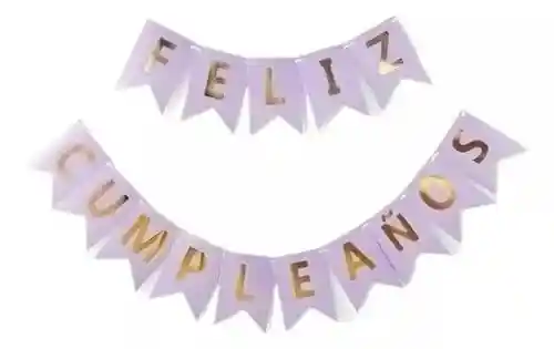 Banderin Feliz Cumpleaños tipo Guirnalda •Color: Lila Mate, Letras Doradas •Total de letras: 15 •Cada Banderín mide: 16.5cm x 12 cm •Se extiende aproximadamente hasta: 1,8 mts. •Incluye Cinta Para Colocar las Letras
