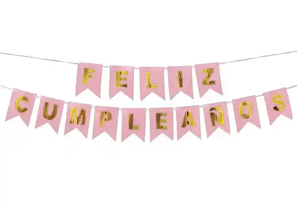 Banderin Feliz Cumpleaños tipo Guirnalda •Color: Rosado Mate, Letras Doradas •Total de letras: 15 •Cada Banderín mide: 16.5cm x 12 cm •Se extiende aproximadamente hasta: 1,8 mts. •Incluye Cinta Para Colocar las Letras
