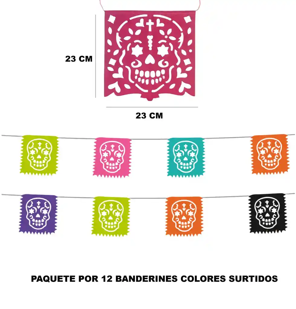 🚩 Banderines elaborados en papel con diseños en colores surtidos de motivo fiesta mexicana calavera, para fiestas temáticas mexicanas, día de los muertos, cumpleaños, carnavales, entre otras. 📏 Cada banderín mide 23 x 23 cm El largo total de los banderines instalados es de 5 metros aproximadamente