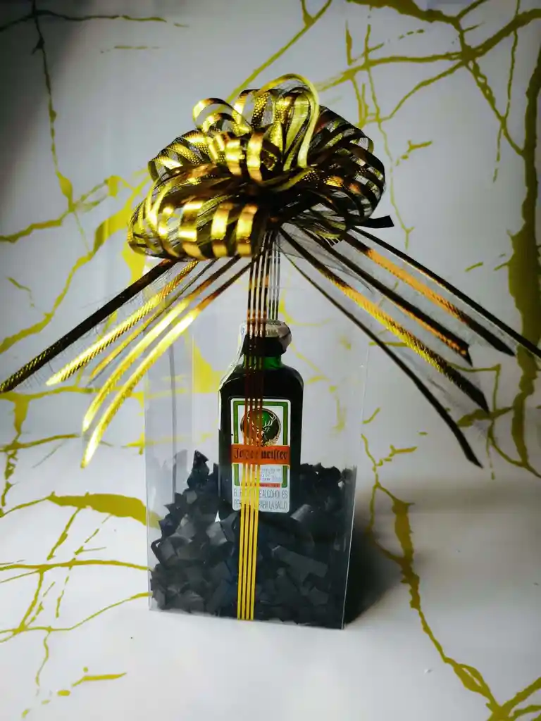Sorprende con un exclusivo detalle premium, cuidadosamente presentado en una elegante caja de diseño sofisticado. Este toque distintivo es perfecto para sorprender a esa persona, dejando una impresión memorable y llena de estilo. En Bandido | Liquors & Detalles, te damos la mejor experiencia y momentos que ni el más buscado se atrevería a olvidar. Porque cada detalle, cada sorbo y cada momento están hechos para robarte una sonrisa y dejar huella. Aquí, los pequeños tesoros, son grandes momentos. Contiene: Licor Jägermeister 20 ml