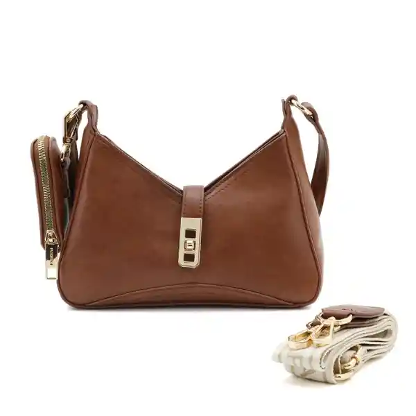 Bandolera pequeña con textura lisa y diseño estructurado con cierre frontal decorativo en herraje dorado. Incluye un práctico monedero lateral removible cargadera corta y una cargadera larga ajustable con detalles estampados, ideal para llevarlo al hombro o cruzado, elaborada en sintetico con forro interno en tela, garantía de 2 meses directamente con el vendedor en cierres, herrajes y costuras