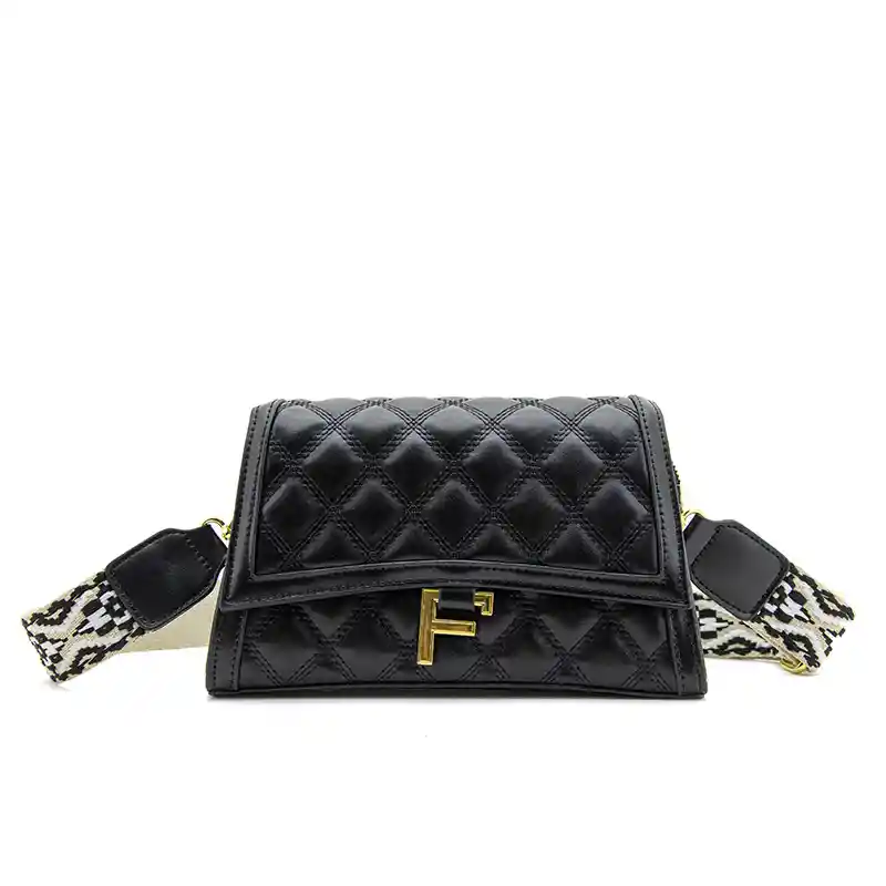 Bandolera cuadrada herraje dorado F con efecto acolchado en rombos, cargadera con estampado etnico en color en contraste y cargadera en sintetico del mismo color del bolso, bolsillo monedero interno, elaborado en sintetico con forro interno en tela y herrajes metalicos, garantia de dos meses directamente con el vendedor en cierres, herrajes y costuras