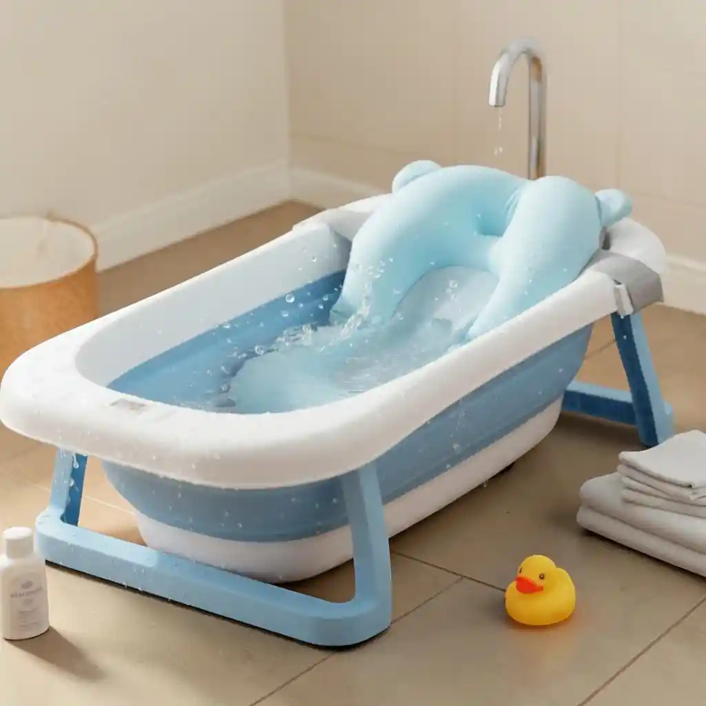 Bañera Tina Plegable Para Bebé Con Termometro + Cojín Malla Azul