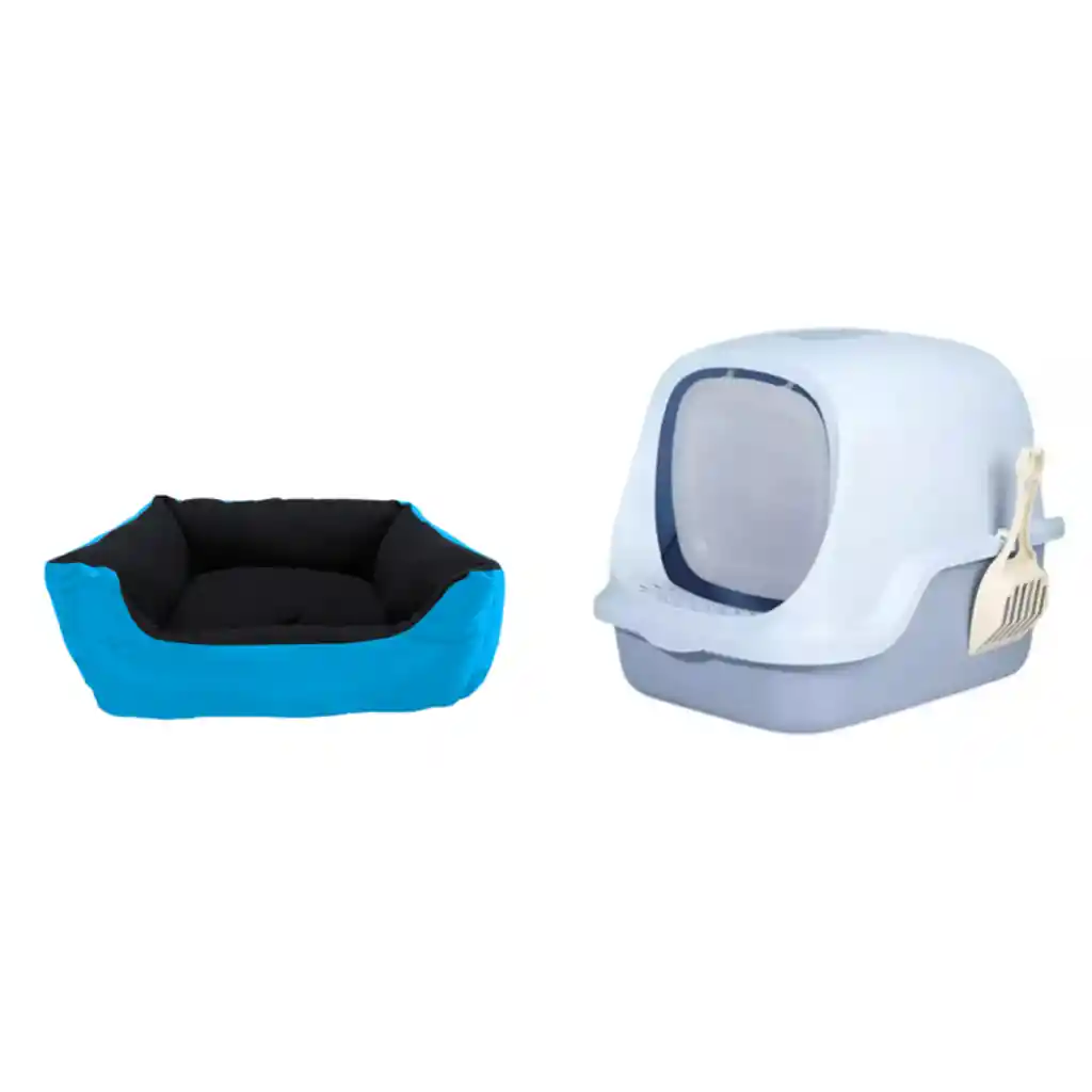 Baño Arenero con filtro y Cama Mediana Lavable Baño Iglu para gatos con filtro y pala Este tipo de baño iglu es ideal para que sus gatos hagan sus necesidades de manera fácil. Al ser un baño cerrado, retiene gran parte del olor y tiene una puerta amplia para que el gato pueda entrar y salir sin problemas. Cuenta con un amplio espacio interior. Se envía con filtro y pala. Etapa: Cachorros y Adultos Material: Plástico Tamaño del Baño Largo: 49 cm Alto: 39 cm Ancho: 38 cm Medidas tina Alto: 17 cm Ancho: 34.5 cm Puerta de Vaivén. La parte superior abre a 90 grados para facilitar la limpieza. La salida tiene rejilla. Filtro para absorber olor. Cama Mediana Lavable Elaborada con relleno supersuave de fibra siliconada, ideal para darle un cómodo y suave descanso a tu mascota. Cuenta con una cremallera para retirar el relleno y poder lavar el forro. Medidas externas Ancho: 54 cm Largo: 44 cm Alto: 18 cm Medidas en el área para dormir Ancho: 30 cm Largo: 22 cm Alto: 12 cm