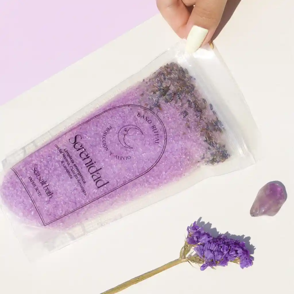Limpieza energética con Sal Marina, Cuarzo Amatista & Lavanda. USO: Para limpiarte energéticamente, aplica un puño de nuestro baño ritual preferiblemente detrás de tu cuello, pies o en todo tu cuerpo estando completamente húmedo, a su vez, ponle todas tus intenciones a tu piedra amatista, puedes pedir que te llene de calma y serenidad para vivir tu vida más plena y luego prepárate para atraer todo lo que deseas. Al finalizar, enjuágate y visualiza como todo lo negativo sale de tu cuerpo y te sientes más cargado de energía positiva.