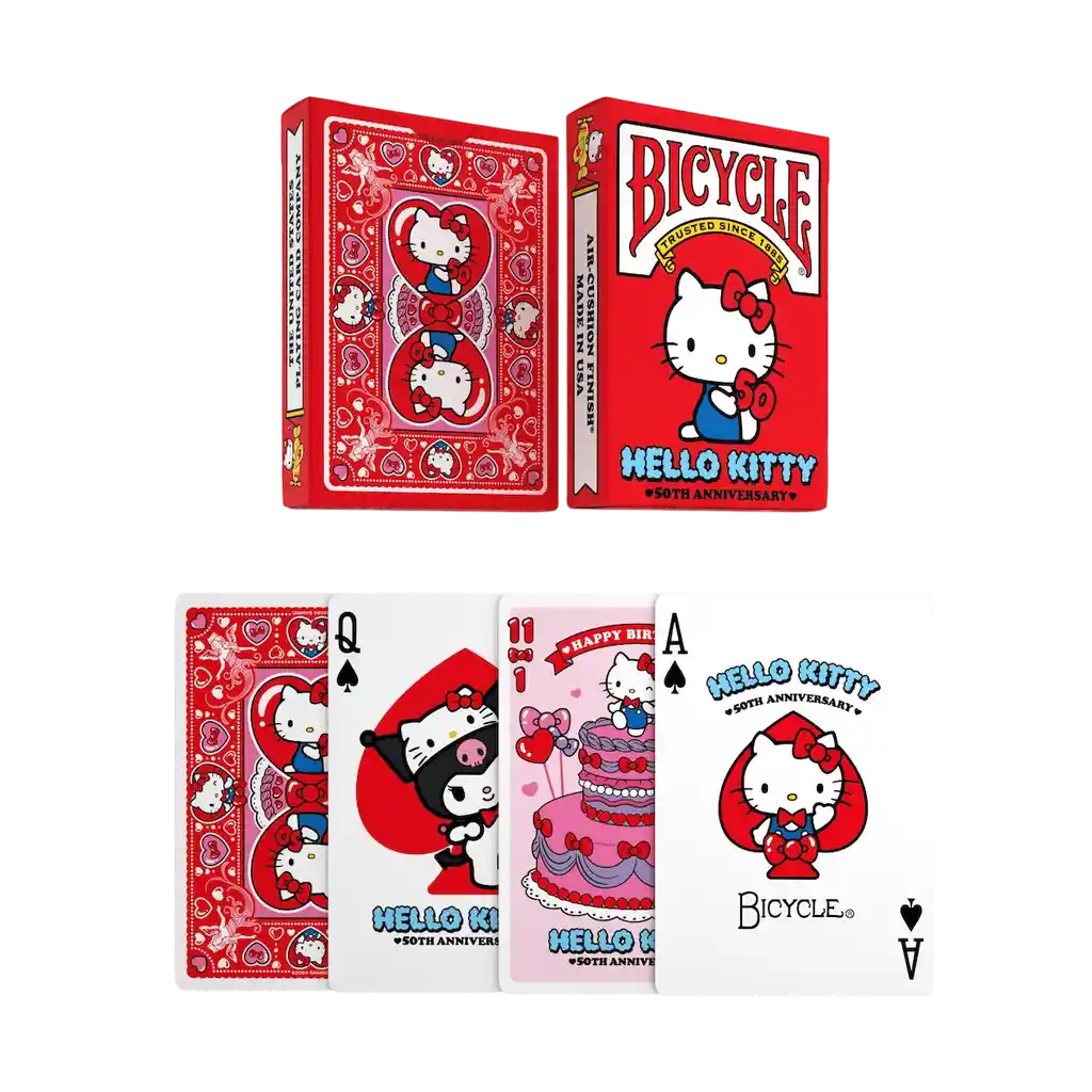 Baraja de cartas Hello Kitty Ya sea que seas un fanático de toda la vida o simplemente aprecies la ternura eterna de la niña favorita de todos, ¡la baraja Bicycle Hello Kitty 50th Anniversary es para ti! Características: Altura: 9.0 cm Ancho: 6.5 cm ¡Cartas Bicycle, el mejor pasatiempo!