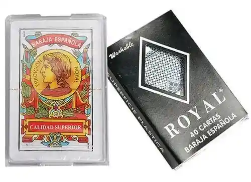 Excelente juego de cartas baraja española de marca ROYAL, disfruta con tus amigos o familia jugando una partida de cartas, tute, escoba, chinchon, cinquillo orejas, 21 entre otras. Esta baraja de cartas royal contiene 40 cartas y están hechas en papel plástico durable de excelente calidad por su material y calidad de impresión. Material: Plástico 100% Marca: Royal Incluye: - 1Baraja 40 cartas - Estuche Plástico