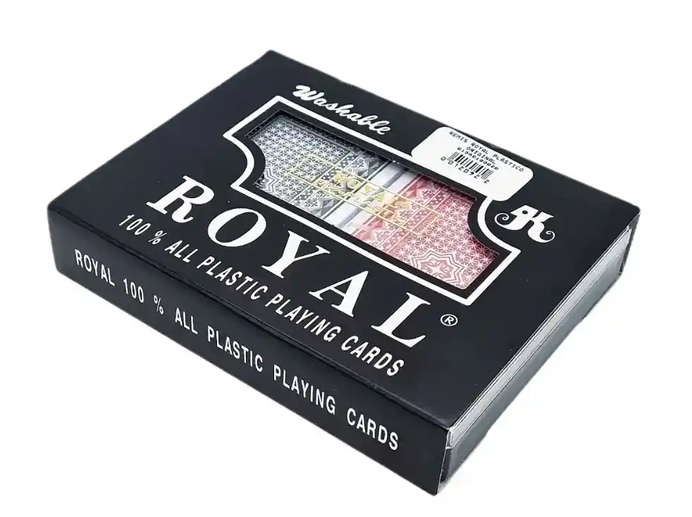 Excelente juego de naipes de marca ROYAL / ROYALTY, disfruta con tus amigos jugando una partida de poker, rummy, 21 o cualquier tipo de juego con estas increíbles cartas. Las cartas de la Baraja Royal están hechas en papel plástico durable, es de excelente calidad por su material y calidad de impresión. Material: 100% Plástico Color: Blanco Incluye: - 2 barajas de cartas de alta calidad - 1 estuche plástico