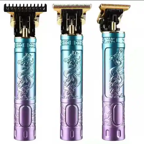 Características: Cuerpo pequeño, punta de aceite retro, forma de gradiente Batería de litio respetuosa con el medio ambiente, máquina calva con cabezal de corte cero, diseño de Peine de límite magnético, fácil de desmontar y montar Gran potencia, chapa suave, seguridad y comodidad Interfaz de carga rápida tipo c, voltaje universal Diseño de cabeza de aceite de distancia cero Los dientes redondeados no dañan el cuero cabelludo Cabezal de molienda automático Cortador de aceite profesional Recomendaciones Evita el agua: La humedad puede hacer que las cuchillas, el motor o los mecanismos internos se oxiden y puedan llegar a que el aparato deje de funcionar. Quita el cabello de las cuchillas y la parte externa con un cepillo Limpia y lubrica las cuchillas con regularidad Especificaciones: Material del cuerpo: aleación de aluminio Peso: 315g Voltaje: 100-240V Potencia nominal: 5W Capacidad de la batería: 1400mAh Tiempo de carga: 2,5 horas Tiempo de uso: 180 minutos Velocidad del Motor: 6500 rpm Material del cuerpo: PC + Carcasa de ABS Estilo: Dragon Vintage Color: Azul con morado Tu compra Incluye: 1 cortadora de pelo 4 peine de límite magnético (1,5/3/4, 5/6MM) 1 aceite lubricante 1 cepillo de limpieza 1 cable de carga USB 1 manual en inglés