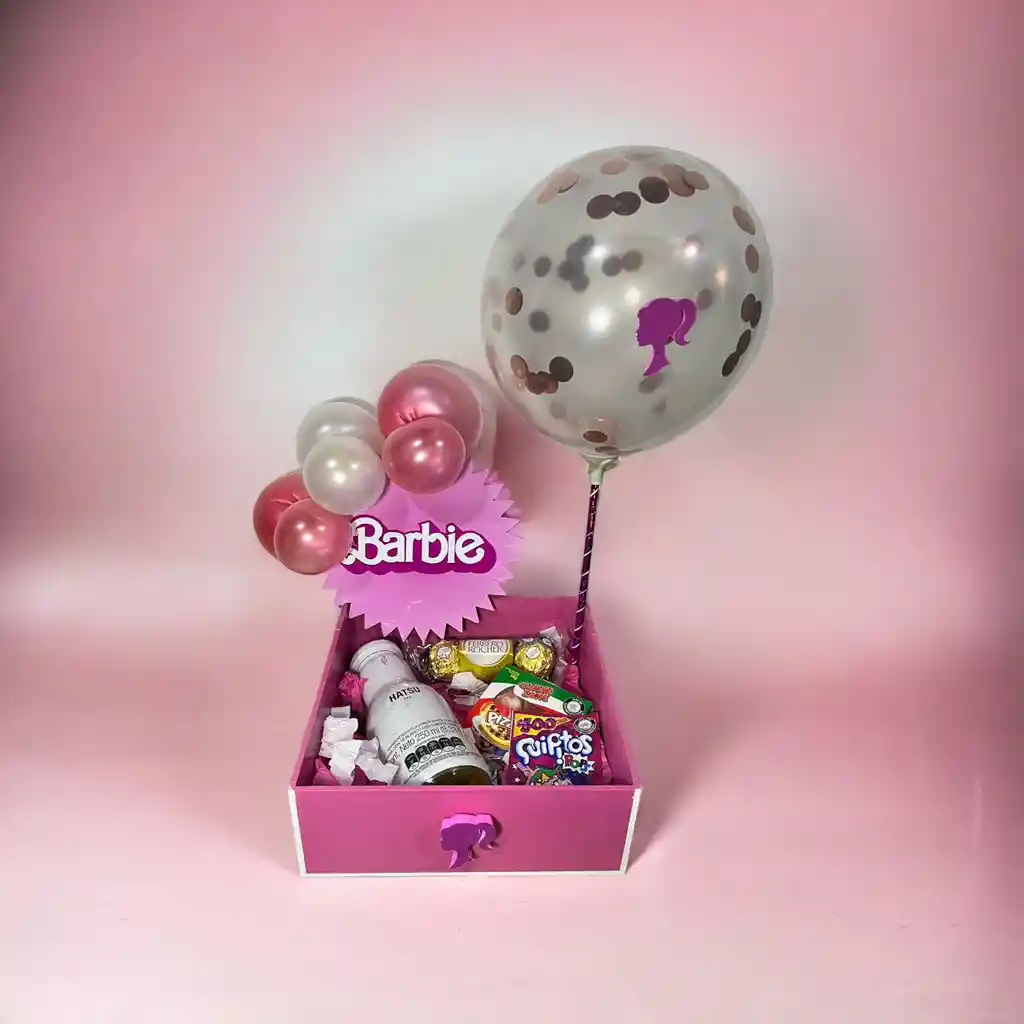 Contiene: Caja en mdf de 20x20x7cm pintada a mano, figura decorativa con logo de Barbie y 6 globos pequeños a su alrededor, 1 globo transparente con confetti en su interior. 1 Bebida Hatsu 250 ml 1 Ferrero X 3 Und 1 Goma Pizza 2 Quipitos 5 Dulces Rainbow