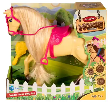Caballo rubio de barbie con cabellos sedoso, incluye accesorios y cepillo.