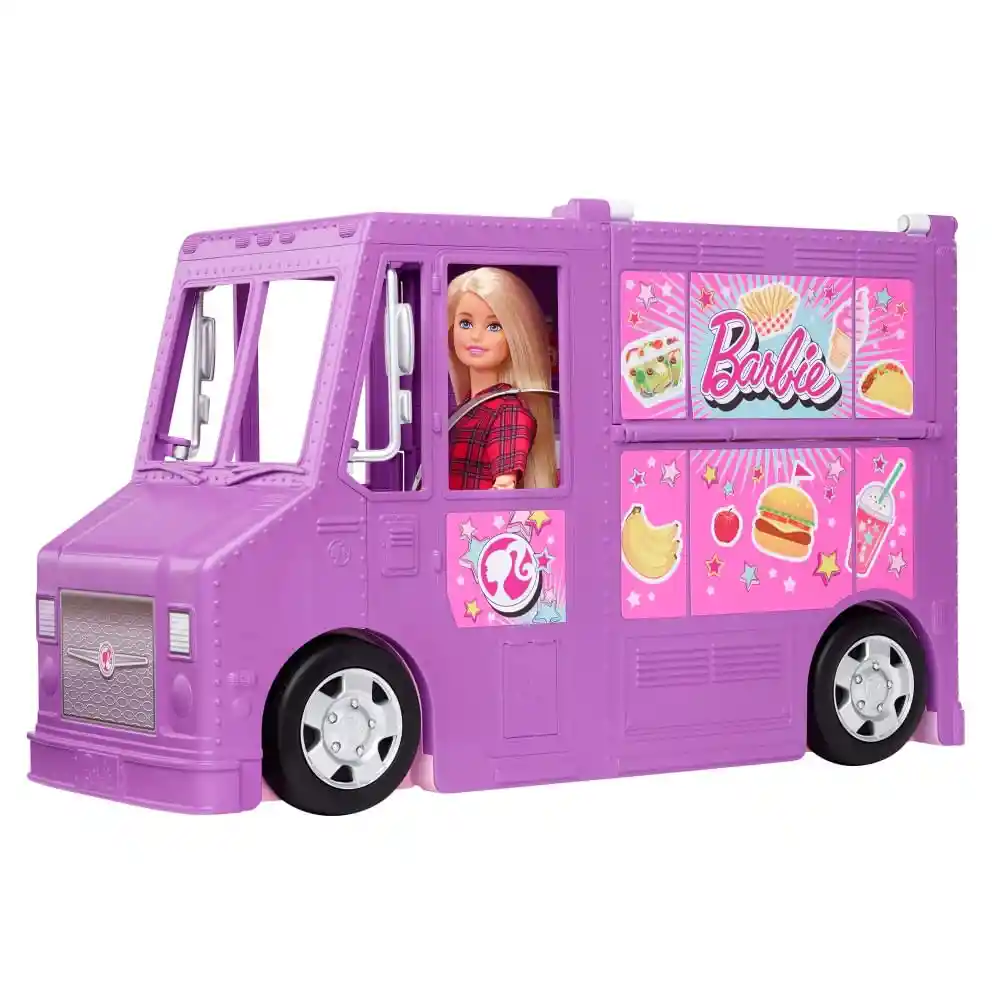 Bip! ¡Bip! Ábrele el paso a un mundo lleno de diversión gastronómica con el Food Truck de Barbie®. Si te encanta preparar comida deliciosa y servir a los clientes ¡entonces te gustará manejar un food truck! El vehículo mide 46 centímetros e incluye diseños coloridos de alimentos de Barbie® en el exterior y se abre para revelar áreas de juego de preparación y servir comida: una cocina y una plancha una estación para preparar batidos una barra para servir y alacenas de almacenamiento. El food truck también cuenta con más de 30 accesorios para contar historias entre los que se encuentran un menú de pizarra que se pone de pie ollas utensilios bandejas para servir platos una freidora para papas fritas una licuadora para batidos alimentos condimentos y una silla para los clientes. Además algunas de las piezas cuentan con una función para enganchar que permite que la muñeca Barbie® (se vende por separado) sostenga las piezas para otorgar un juego realista. ¡Mmm! ¿Qué cocina Barbie®? Una vez que el cliente haya hecho su pedido Barbie® podrá completar la compra en la caja registradora. Incluye el Food Truck de Barbie® y más de 30 accesorios para crear divertidas historias. Excelente regalo para niñas de 3 años en adelante especialmente aquellas que aman cocinar servirle a clientes y perfeccionar sus habilidades culinarias. Los colores y las decoraciones pueden variar No incluye muñeca.