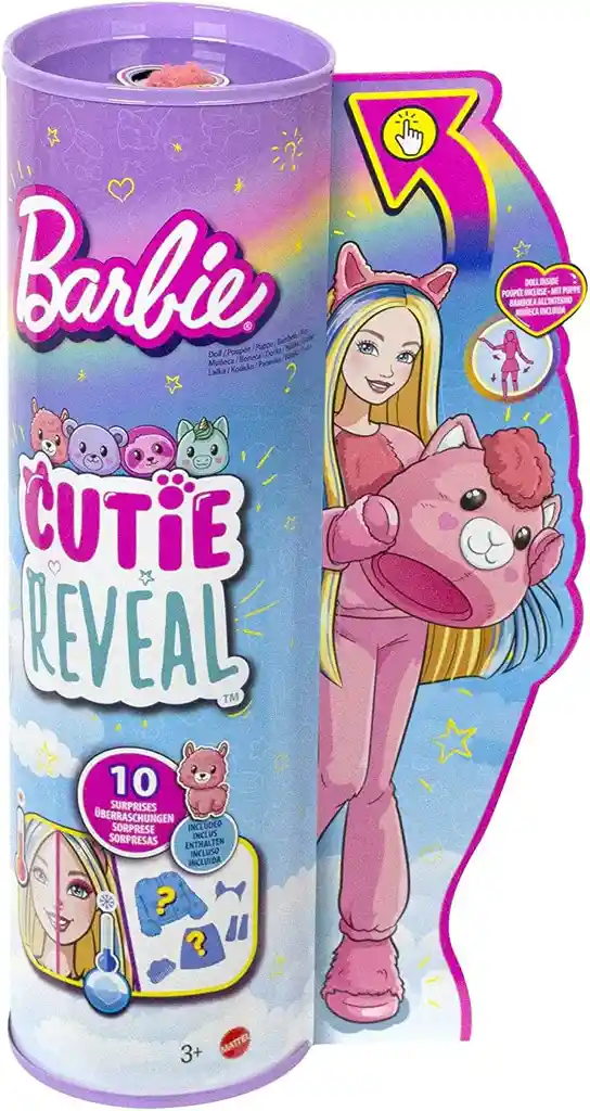 Con 10 sorpresas en 1 paquete, las muñecas Barbie Cutie Reveal Fantasy Series ofrecen la experiencia de desembalaje más linda con amigos y modas de animales suaves de peluche, sorpresas y diversión transformadora (cada una se vende por separado, sujeto a disponibilidad). Desempaca el paquete para encontrar una llama de fiesta suave y afelpada con una muñeca Barbie en el interior Levanta la cabeza del disfraz para revelar una muñeca Barbie articulada con pelo largo y colorido y detalles de cara parpadeante. Abre las 4 bolsas sorpresa para encontrar ropa y accesorios: una falda brillante, un par de zapatos geniales, peine de esponja, diadema de llama y mini llama para mascotas Los niños pueden vestir y complementar la muñeca Barbie invertiendo la parte superior del disfraz para encontrar una chaqueta de forro polar súper suave con un estampado de confeti. La cabeza del disfraz se convierte en una cama para el mini amigo de llama