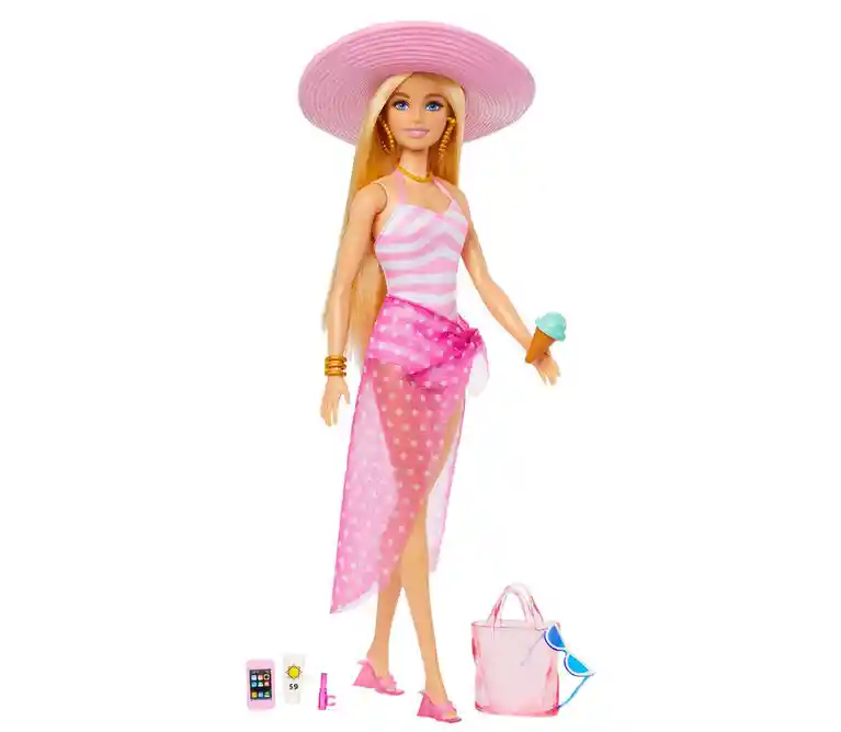 Muñeca Barbie rubia con bañador y accesorios de playa, edición The movie 2023, Original Mattel. Con los pies en la arena y un helado en la mano, esta muñeca Barbie rubia tiene todo lo necesario para pasar un día de relax en Malibú. Lleva un veraniego bañador rosa y una bolsa llena de accesorios playeros. Los niños a partir de 3 años se lo pasarán en grande con esta muñeca playera Barbie. La muñeca Barbie lleva un bonito bañador a rayas rosas y blancas con un pareo de lunares transparentes atado a la cintura. Los pendientes de aro dorados y las sandalias peep-toe le añaden un toque muy mono. Otros accesorios de estilo incluyen un sombrero de ala ancha, gafas de sol de ojo de gato, un collar dorado y una pulsera. Su bolso de mano rosa es perfecto para guardar la crema solar, el pintalabios y el smartphone; el cucurucho de helado de menta se engancha a su mano para posar de forma realista.