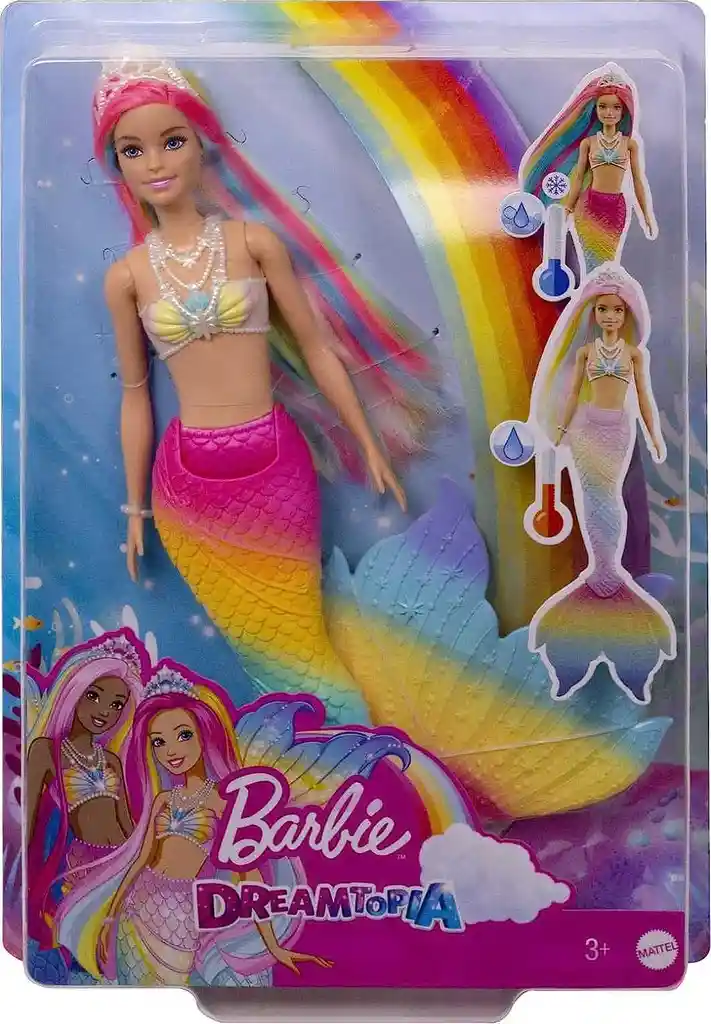 algodón Añade una fantástica transformación de color a la hora de juego con la sirena Dreamtopia mágica color arco iris de Barbie. La sirena de Barbie tiene un aspecto de fantasía en colores neón brillantes con una tiara en su cabello de los colores del arco iris, cola multicolor y corpiño con detalles inspirados en el mar. Sumerge la muñeca Barbie en agua tibia para ver su cabello, corpiño y cola transformarse al instante y revelar un arco iris de tonos pastel. Sumérgela en agua fría para verla cambiar a su aspecto original de colores neón brillantes y revive la transformación una y otra vez. Los amantes de los cuentos de hadas se divertirán transformando el aspecto de la muñeca Barbie y llevándola a aventuras encantadas bajo el mar. Las sirenas Dreamtopia mágicas color arco iris de Barbie son un estupendo juguete para el baño o regalo para edades de 3 a 7 años.