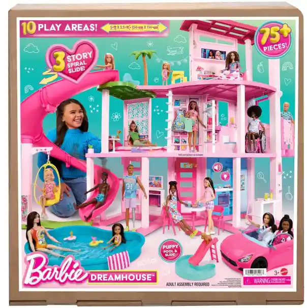 Bienvenido a Barbie Dreamhouse, donde el juego de 360 grados inspira diversión sin fin. Esta versión actualizada de la icónica casa de muñecas cuenta con un diseño abierto, características premium y más de 75 piezas de narración. Barbie puede organizar la fiesta en la piscina de sus sueños con el espectacular tobogán espiral de tres pisos de su casa. Mira cómo la muñeca Barbie y sus amigos se arremolinan por el tobogán hacia la piscina. Muñecas no incluidas. Esta casa de muñecas funciona como un verdadero palacio para mascotas, e incluso incluye una figura de cachorro. Los amigos peludos se divertirán con el elevador de mascotas, tobogán y piscina para mascotas, cama para mascotas, puerta para perros y casa para mascotas.