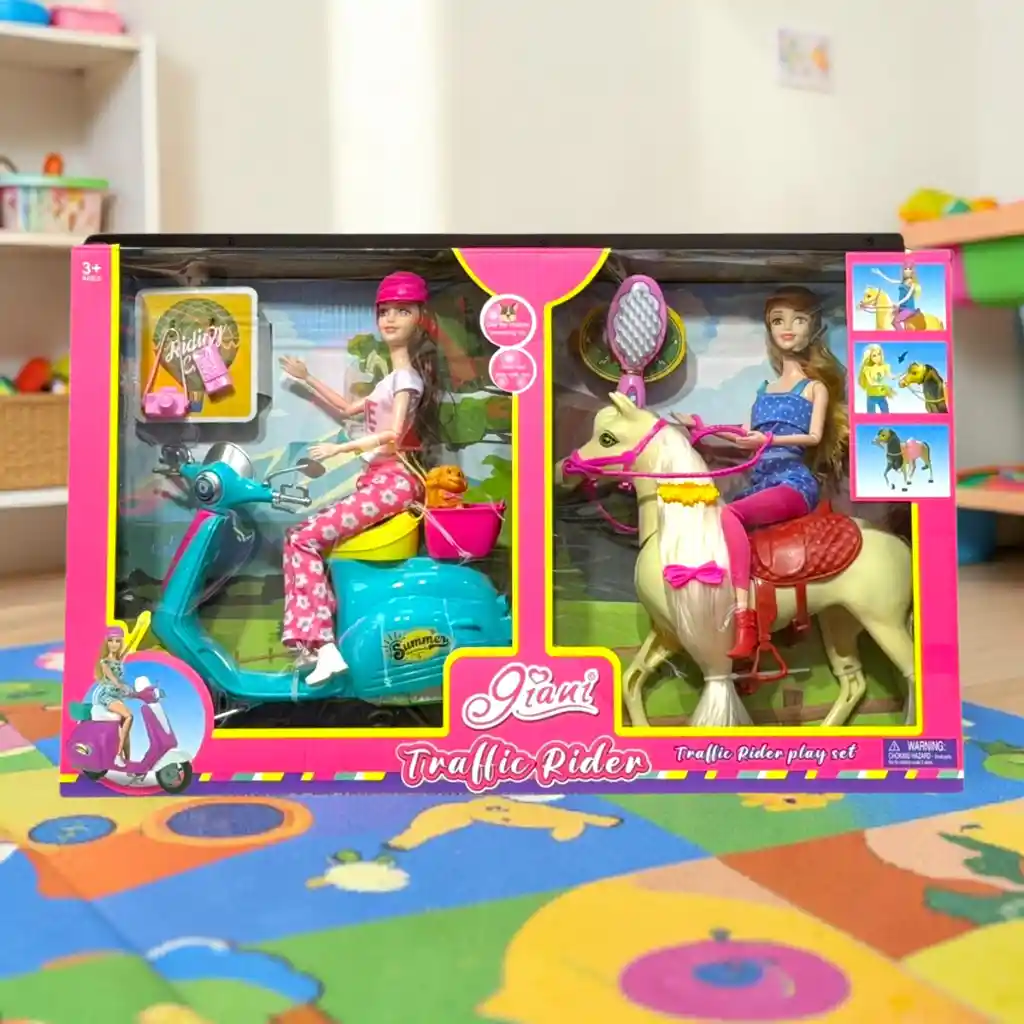 Descubre la emocionante aventura que ofrece la Barbie Motocicleta y caballo, un conjunto ideal para estimular la imaginación de los más pequeños. Permite que dos muñecas se embarquen en un viaje lleno de diversión y creatividad. Con una motocicleta estilizada y un hermoso caballo, los niños podrán crear historias únicas y emocionantes. El set incluye accesorios como un cepillo, una cámara y una cartera, que añaden un toque especial a la experiencia de juego. Fabricado en plástico de alta calidad, este producto es resistente y seguro para niños a partir de 3 años. La combinación de la motocicleta y el caballo fomenta el juego activo y la interacción social entre los niños.