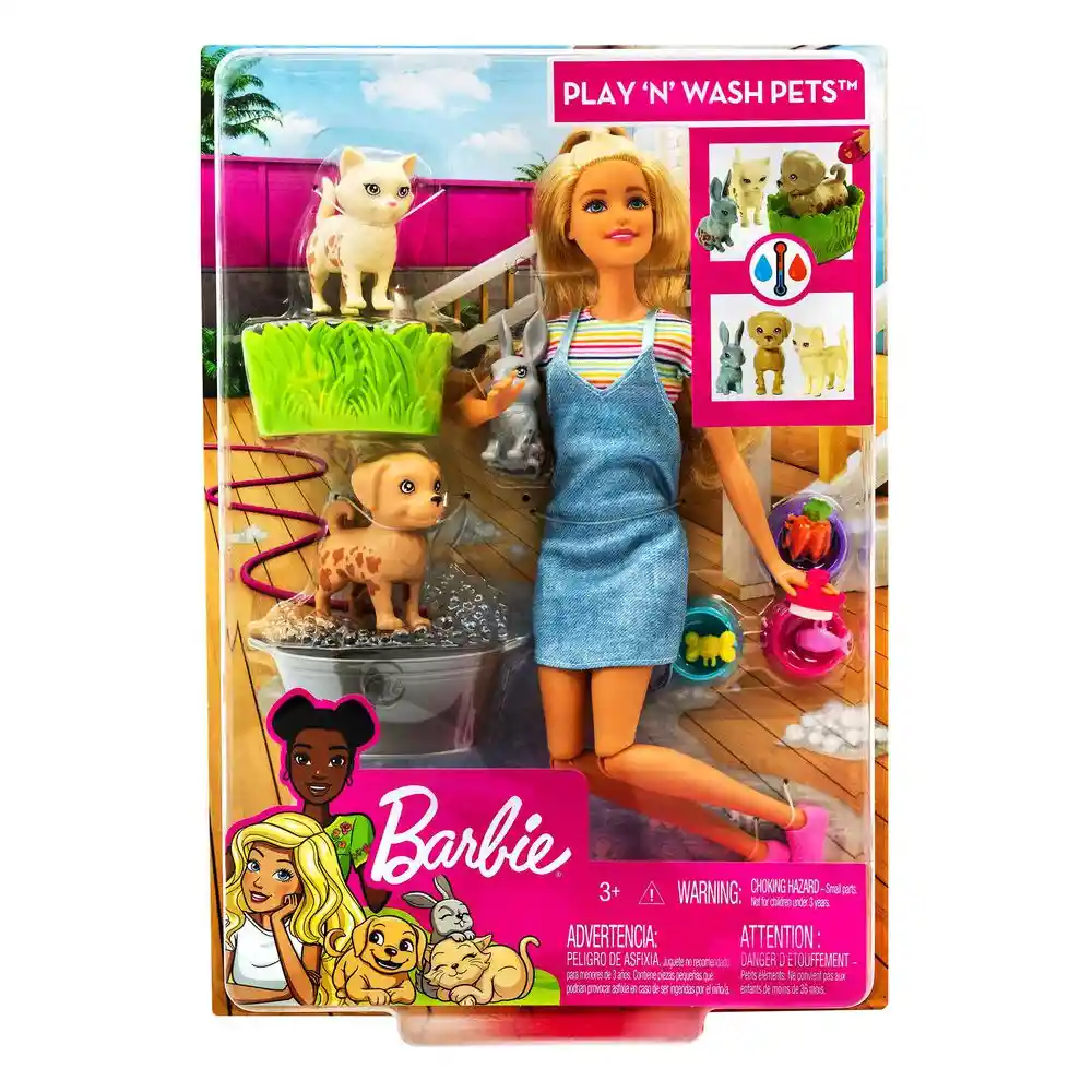 Barbie ama a todos los animales, especialmente a los perritos, gatitos y conejitos. El set de juego Barbie baño de mascotas tiene uno de cada uno de estos animalitos para que la muñeca los alimente, juegue con ellos, los lave y acurruque. Además, todos tienen una genial función de cambio de color que fomenta el cuidado a través del juego. Las niñas que amen a los animales se divertirán mucho al descubrir cómo cuidar a las mascotas con la muñeca y sus tres adorables mascotas.