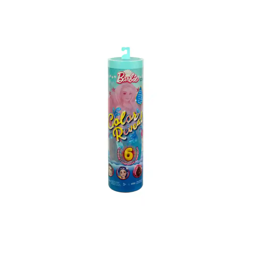 Las muñecas Barbie Color Reveal ofrecen una experiencia de desempaquetado llena de sorpresas, ¡seis de ellas! Los niños encontrarán una de las cuatro muñecas únicas en esta serie de sirenas: cada una tiene cabello largo con una raya brillante que cambia de color. ¿Qué muñeca descubrirás? Retira la capa exterior del empaque, abre el tubo y saca una muñeca de moda Barbie, cuyo look de sirena está cubierto con un revestimiento Color Reveal y bolsas sorpresa. Los accesorios incluyen una aleta de cola desmontable, un collar con dijes marinos, una diadema y un peine de conchas marinas. Usa el tubo de empaque para guardar estas y otras piezas. Los niños pueden coleccionarlas todas para divertirse mezclando y combinando. Cada una se vende por separado, sujeta a disponibilidad. Las muñecas no pueden tenerse en pie solas. Los colores y las decoraciones pueden variar. Con 6 sorpresas en 1 paquete, las muñecas Barbie Color Reveal brindan olas de alegría: ¡los niños se divertirán revelando esta serie de sirenas con la innovación original Color Reveal! Comience quitando la capa exterior del embalaje, abriendo el tubo y sacando una muñeca de moda Barbie, cuyo look de sirena está cubierto con una capa de rocío marino brillante Color Reveal y bolsas sorpresa. Abre las bolsas para descubrir ropa y accesorios para darle estilo a tu muñeca Barbie: una aleta de cola desmontable, un collar con dije marino, una linda diadema y un peine de conchas marinas. ¡Usa agua helada y caliente para transformar el cabello de la muñeca y lograr un momento asombroso! Las muñecas Barbie Color Reveal son un gran regalo para niños de 3 años en adelante, quienes pueden coleccionarlas todas para expandir la diversión del estilo y la narración. Fabricante: Mattel Importador: Mattel Colombia Recomendaciones: Requiere de la supervisión directa de un adulto, puede contener partes pequeñas, riesgo de asfixia o ahogamiento, no destinar este juguete para menores por debajo de la edad establecida en la etiqueta. Edad mínima sugerida: 3 años Lote: Dato variable. Se puede verificar en el sticker que trae el producto físico. Fecha de fabricación: Dato variable. Se puede verificar en el sticker que trae el producto físico.