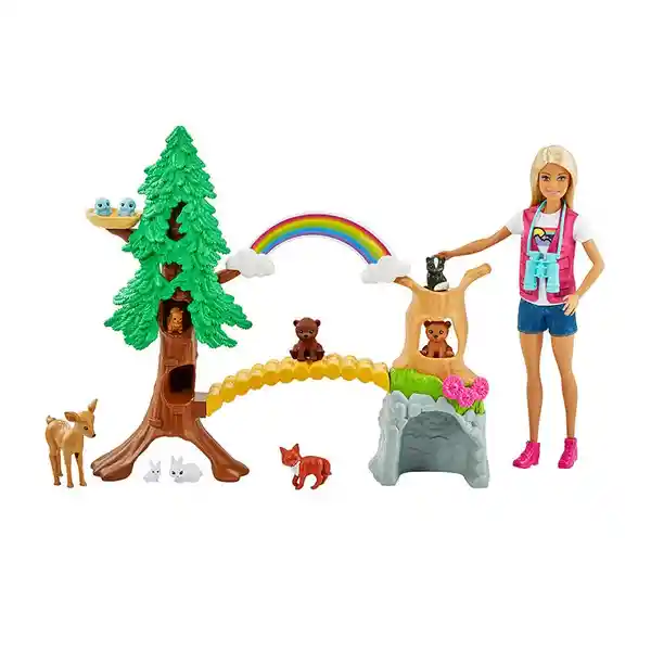 Este Juego Barbie Presenta un Entorno al Aire Libre Con un Árbol un Camino de Puente Una Cueva y un Hermoso Arcoíris en la Parte Superior Además de Divertidas Áreas Interactivas Donde Los Ocho Animales Diferentes (Incluidos) Pueden Descansar Esconderse y Explorar.
