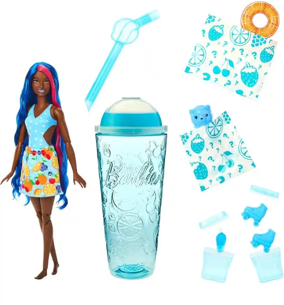 Funciones y detalles Con 8 sorpresas en un paquete, las muñecas Barbie Pop Reveal Fruit Series ofrecen una experiencia sensorial de desembalaje con diversión temática de frutas Los niños quitan la capa exterior del embalaje, abren la taza y sacan las bolsas sorpresa, luego vuelven a atornillar la tapa y revientan la parte superior con la pieza similar a una pajita para liberar el slime azul esponjoso sobre los cubitos de hielo Desempaca para encontrar una muñeca Barbie articulada y perfumada a ponche de frutas, un cachorro de mascota esponjoso y perfumado y accesorios que coincidan con el tema del sabor de la fruta Descubre piezas adicionales dentro de los cubitos de hielo que realmente se abren, como una mini bebida esponjosa y patines para muñecas Barbie - utilícelo para almacenamiento o repetir revelaciones Barbie La muñeca tiene el pelo largo y azul y viene con pantalones cortos con temática de frutas y una mascota perfumada y esponjosa a juego para la diversión de contar historias Utiliza agua fría y helada para revelar la raya brillante del cabello y el maquillaje de la cara de la muñeca y agua tibia para volver a cambiar de color para una sorpresa repetida de cambio de color Barbie Las muñecas Pop Reveal Fruit Series son un gran regalo para niños de 3 años en adelante, especialmente aquellos que aman la diversión sensorial.