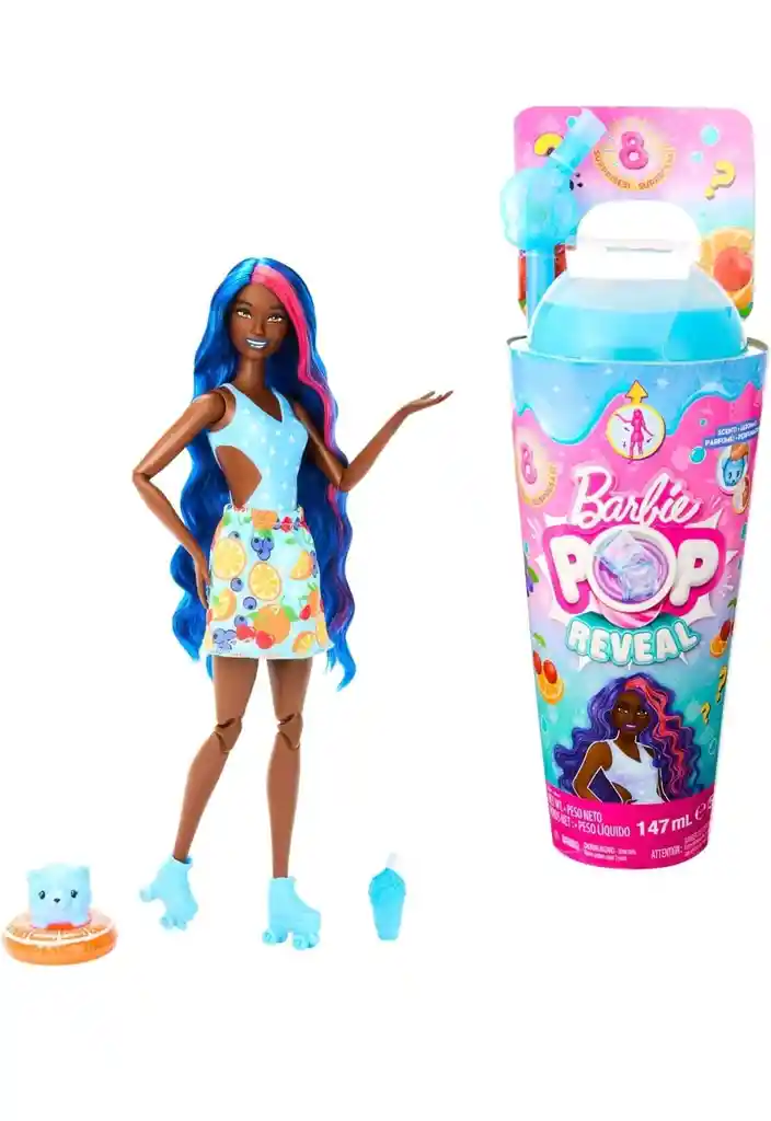 Funciones y detalles Con 8 sorpresas en un paquete, las muñecas Barbie Pop Reveal Fruit Series ofrecen una experiencia sensorial de desembalaje con diversión temática de frutas Los niños quitan la capa exterior del embalaje, abren la taza y sacan las bolsas sorpresa, luego vuelven a atornillar la tapa y revientan la parte superior con la pieza similar a una pajita para liberar el slime azul esponjoso sobre los cubitos de hielo Desempaca para encontrar una muñeca Barbie articulada y perfumada a ponche de frutas, un cachorro de mascota esponjoso y perfumado y accesorios que coincidan con el tema del sabor de la fruta Descubre piezas adicionales dentro de los cubitos de hielo que realmente se abren, como una mini bebida esponjosa y patines para muñecas Barbie - utilícelo para almacenamiento o repetir revelaciones Barbie La muñeca tiene el pelo largo y azul y viene con pantalones cortos con temática de frutas y una mascota perfumada y esponjosa a juego para la diversión de contar historias Utiliza agua fría y helada para revelar la raya brillante del cabello y el maquillaje de la cara de la muñeca y agua tibia para volver a cambiar de color para una sorpresa repetida de cambio de color Barbie Las muñecas Pop Reveal Fruit Series son un gran regalo para niños de 3 años en adelante, especialmente aquellos que aman la diversión sensorial
