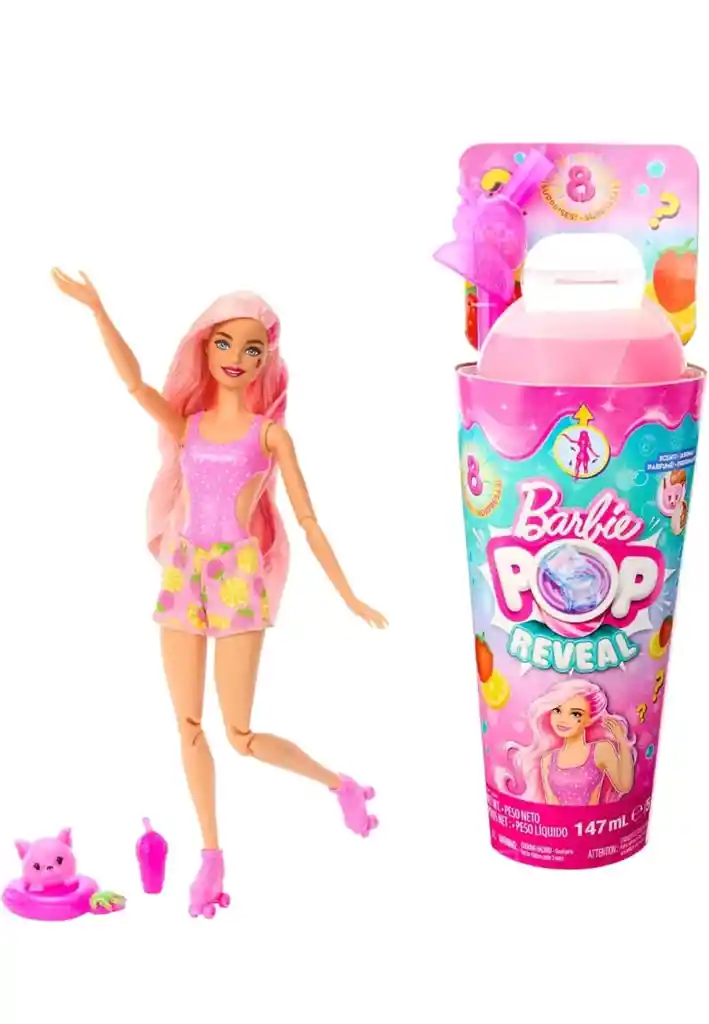 Barbie Muñeca Pop Reveal y accesorios, aroma a limonada de fresa con cabello rosa, 8 sorpresas incluyen slime y cachorro blando