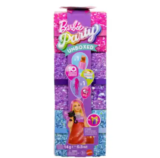 Somos Danny Toys, ofrecemos la muñeca Barbie Party Unboxed. Esta serie de muñecas ofrece una experiencia de desempaquetado con temática de fiesta que incluye 10 sorpresas. Cada paquete contiene una muñeca Barbie y una mascota, además de accesorios de moda y otros elementos sorpresa. La experiencia de "unboxing" se presenta como una pila de regalos de fiesta. Las sorpresas incluyen una función de cambio de color en la cara de la muñeca y la mascota al usar agua fría y caliente.
